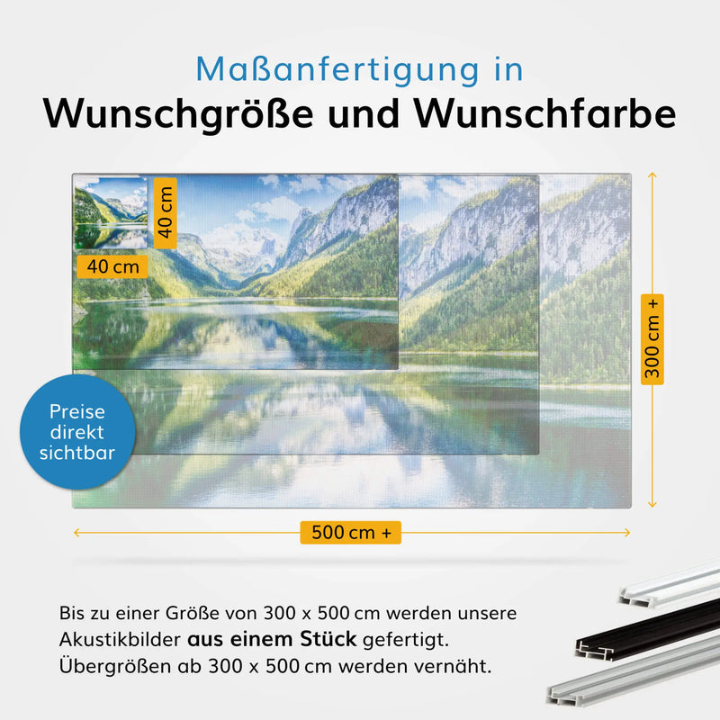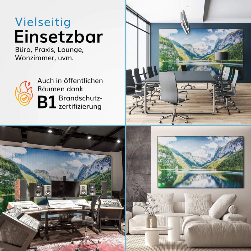 Wie Du möchtest! Mit Deinem Lieblingsmotiv aus Deinem letzten Urlaub, Deinem Firmenlogo, einem kurzen und knackigen Text oder einem tollen Bild aus unserer gigantischen Datenbank! Du bist völlig frei in Deiner Entscheidung. Je nach Größe gelingen Dir mit Deinem Akustikbild sogar aufwendige Inszenierungen, die dem Raum einen unverwechselbaren Charakter geben. Möchtest Du einen Akustikstoff bedrucken lassen, solltest Du wissen, dass die Drucklänge bei uns unbegrenzt ist und die Druckbreite stolze 300 Zentimeter betragen kann. Unser Akustikstoff ist UV-beständig und schwer entflammbar. Er verfügt über eine innovative Wabenstruktur, die den auftreffenden Schall zwar effektiv dämpft, das Motiv aber dennoch wunderschön zur Geltung bringt. Bei Bedarf kannst Du den Stoff sogar mit einem leicht feuchten Lappen abwischen. So lässt sich Staub kinderleicht entfernen. Du hast noch Fragen? Melde Dich gerne bei uns!