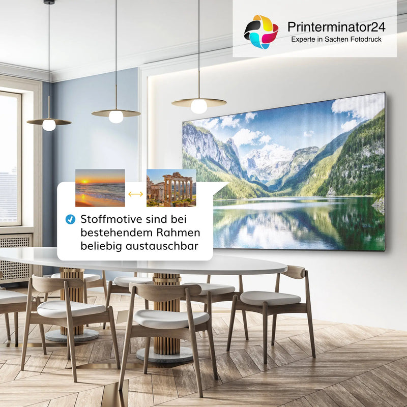 Wenn Du bei uns einen Akustikstoff bedrucken lässt, kannst Du ihn entweder „solo“ oder zusammen mit einem hochwertigen Textilspannrahmen bestellen. Beide Varianten haben ihre Vorteile. Der lose Stoff schenkt Dir für Deine DIY-Ideen eine höchstmögliche gestalterische Freiheit. Du kannst ihn genau so anbringen, wie Du möchtest, und dabei Deiner Kreativität freien Lauf lassen. Er ist auch immer dann die beste Option, wenn Du bereits ein Rahmensystem besitzt und Dir etwas Abwechslung wünschst. In diesem Fall kannst Du nämlich ein Akustikbild selbst gestalten und es als Wechselstoff für Deinen vorhandenen Rahmen verwenden. Das Aufspannen des Stoffs auf den Rahmen funktioniert mit unserem „EasyFix-Wechselsystem“ übrigens ganz einfach, unkompliziert und schnell, so dass Du jederzeit flexibel auf veränderte Anforderungen reagieren kannst.