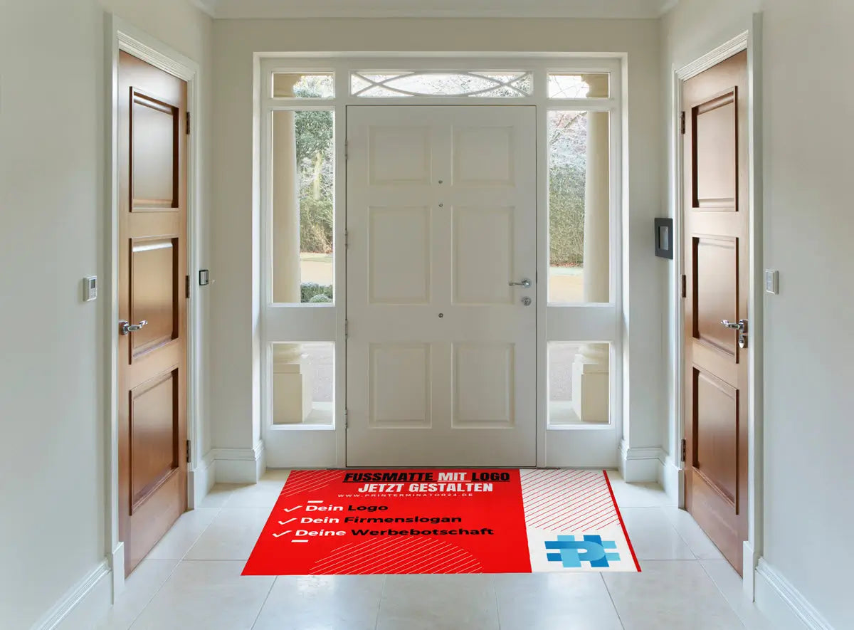 In gewerblichen Objekten wie Büros, Geschäften oder Praxen, aber auch in öffentlichen Einrichtungen, ist eine große Fußmatte mit Logo ein unverzichtbarer Helfer. Sie schützt den Boden in stark frequentierten Bereichen vor Abnutzung und dient gleichzeitig als auffällige Werbefläche. Ob Du mit einem freundlichen „Herzlich Willkommen“ in lebendigen Farben Kunden und Besucher empfängst oder das Logo Deines Unternehmens präsentierst, bleibt ganz Dir überlassen.